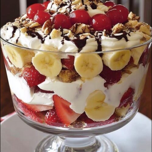 Dieses Banana Split Trifle ist die süße Verführung, die auf keiner Desserttafel fehlen darf. Die Kombination aus cremigem Pudding, frischen Bananen, Erdbeeren und Schokosoße sorgt für echte Glücksmomente. Und das Beste: Dieses Rezept gehört definitiv zur Kategorie Nachtisch Rezepte, die nicht nur einfach zuzubereiten, sondern auch ein echter Hingucker sind. Ob du nach healthy food rezepte abendessen gesund suchst oder schnelle leichte rezepte abendessen planst – dieser Nachtisch passt perfekt als krönender Abschluss eines gesunden Tagesmenüs. Auch für Fans von ausgefallene Rezepte Abendessen und vegetarische rezepte abendessen ist dieses Trifle eine süße Überraschung. Denn es zeigt, dass Nachtisch Rezepte sowohl raffiniert als auch unkompliziert sein können. Wenn du schnelle gesunde rezepte abendessen oder schnelle und gesunde rezepte abendessen liebst, wirst du dieses Dessert schätzen. Es braucht keine lange Vorbereitung, bietet aber maximalen Geschmack. Ideal für Familienfeste, Geburtstage oder einfach mal zwischendurch.