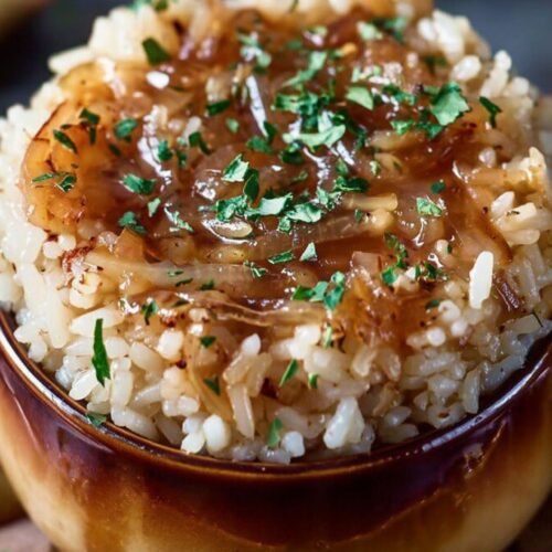Dieses Gericht eignet sich hervorragend zur Vorbereitung. Koche den Zwiebelsuppen-Reis am Vortag, bewahre ihn im Kühlschrank auf und wärme ihn bei Bedarf in der Mikrowelle oder im Ofen auf.