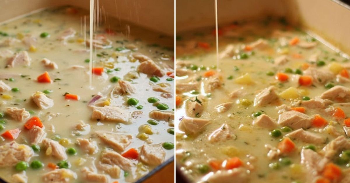 - In einer großen Schüssel Kondenssuppe, Milch, Käse, Gemüse und Hähnchen vermengen. Mit Salz und Pfeffer würzen.