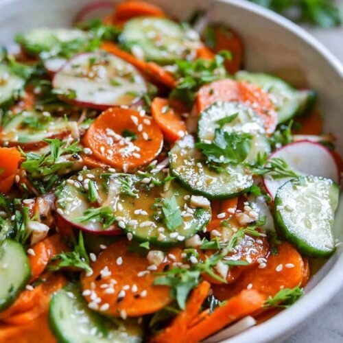 Ein asiatischer Gurkensalat mit Sesam gehört zu den einfachsten und frischesten Salaten, die sich in wenigen Minuten zubereiten lassen. Zwei Hauptzutaten, eine einfache Würzmischung und ein bisschen Ruhezeit machen diesen Salat zu einem vielseitigen Begleiter.
